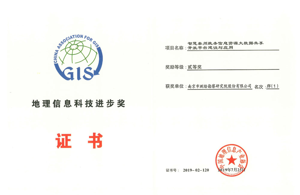 中国地理信息科技前进二等奖——智慧泰州政务信息资源大数据共享开放平台建设与应用